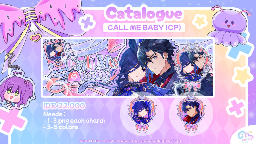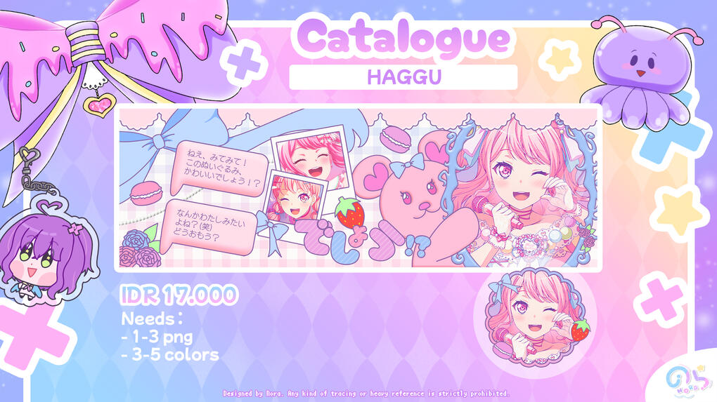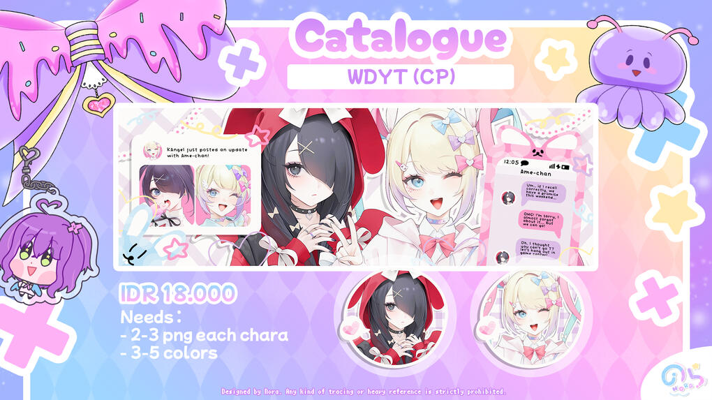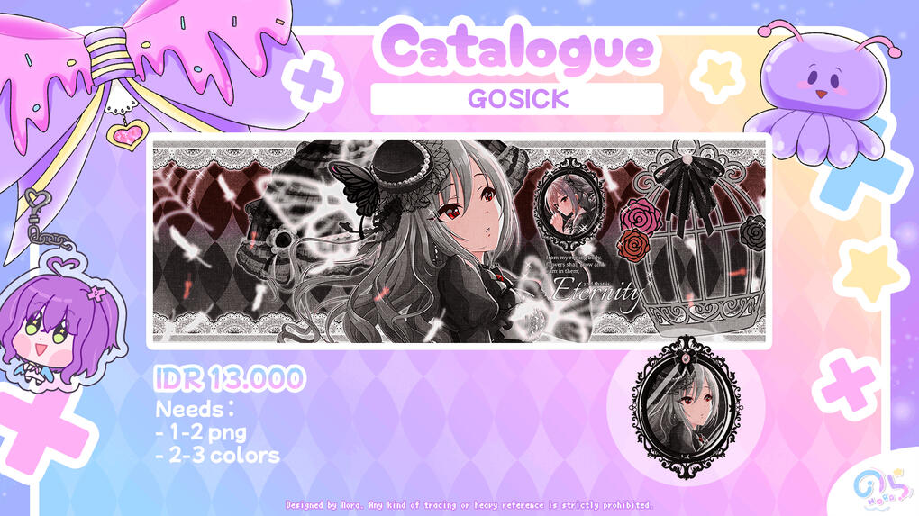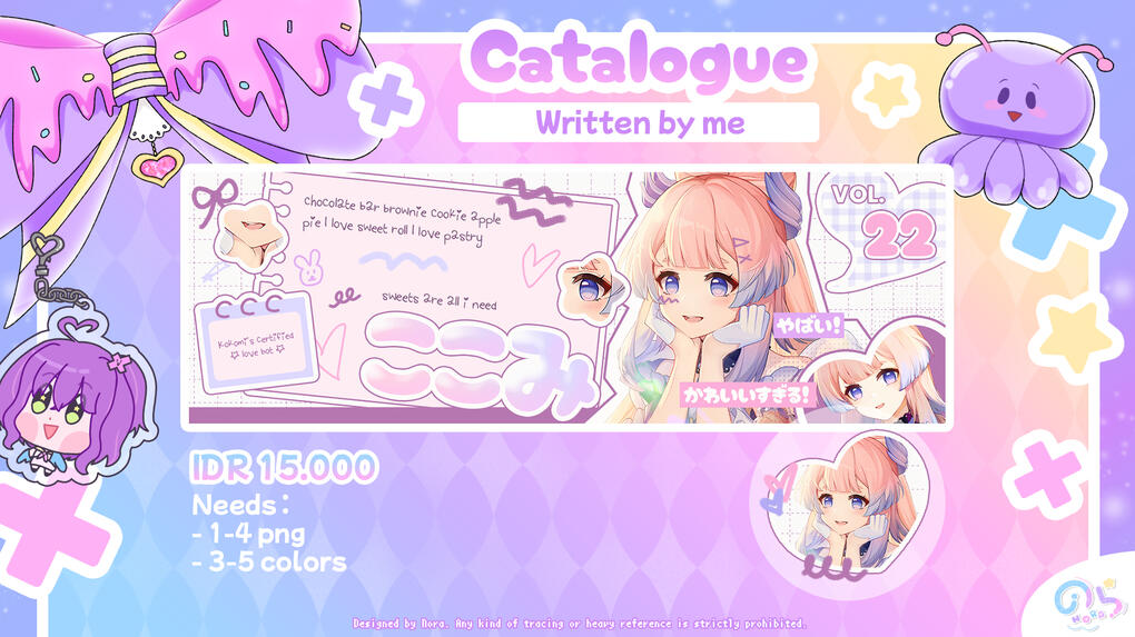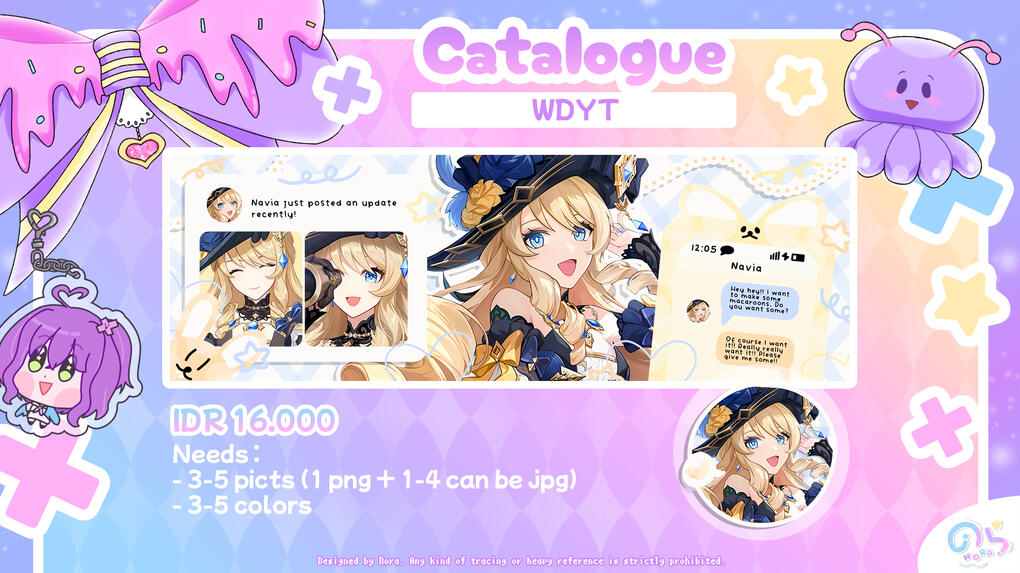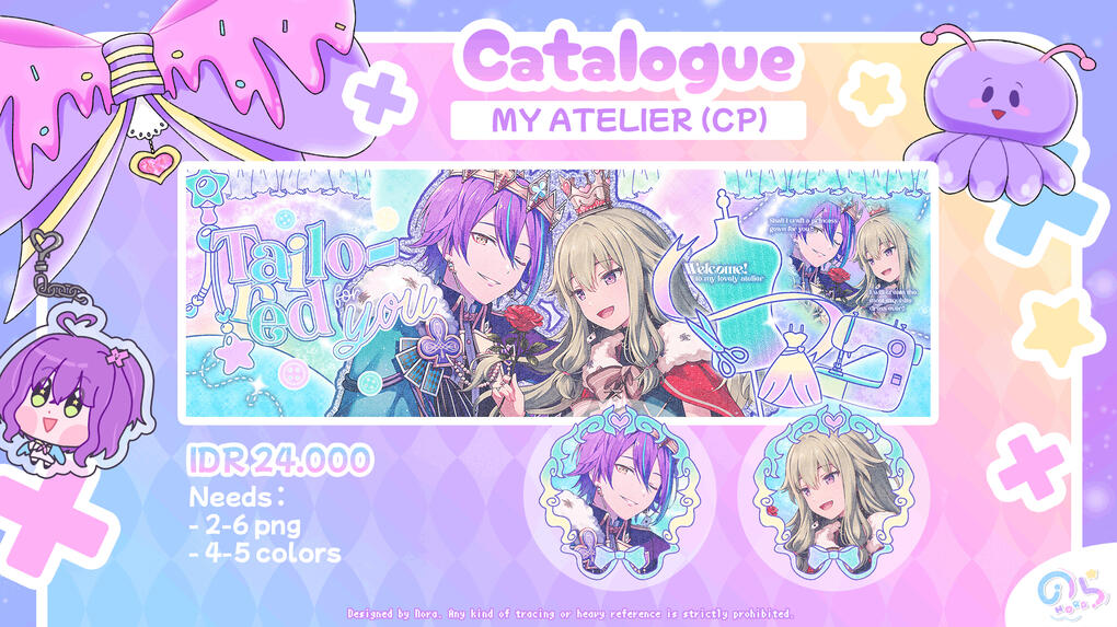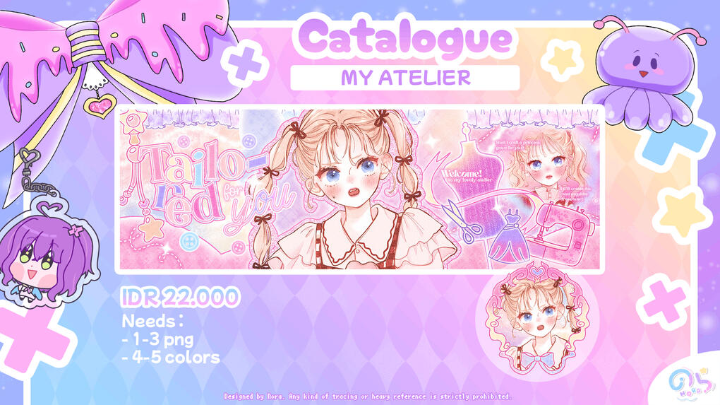 Semua desain yang ada di katalog akan diberi warna sesuai dengan foto yang diberikan. Kalau mau req warna, jangan lupa cantumin color palette di form :3 boleh berupa kode warna maupun foto6. REVISI