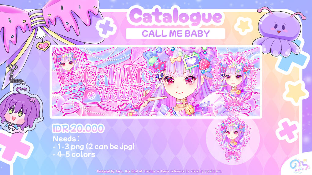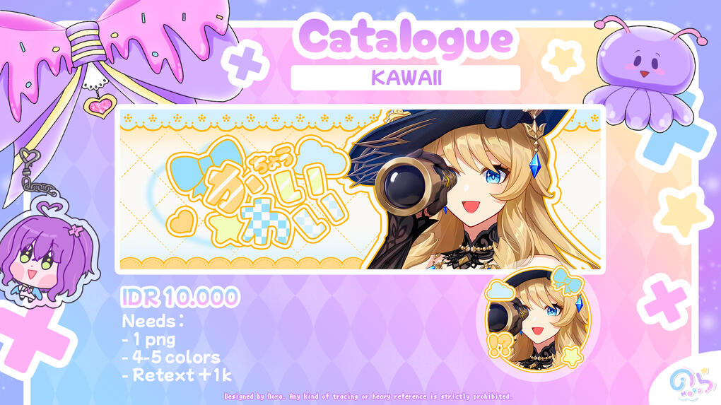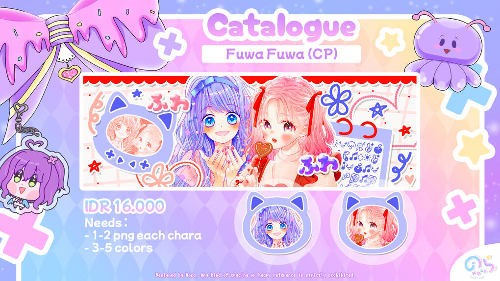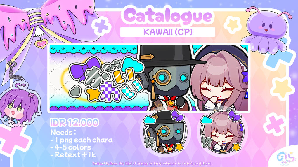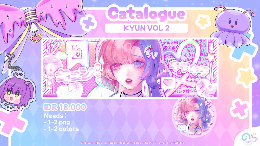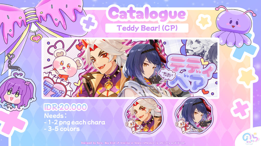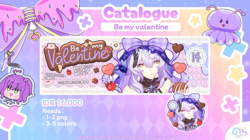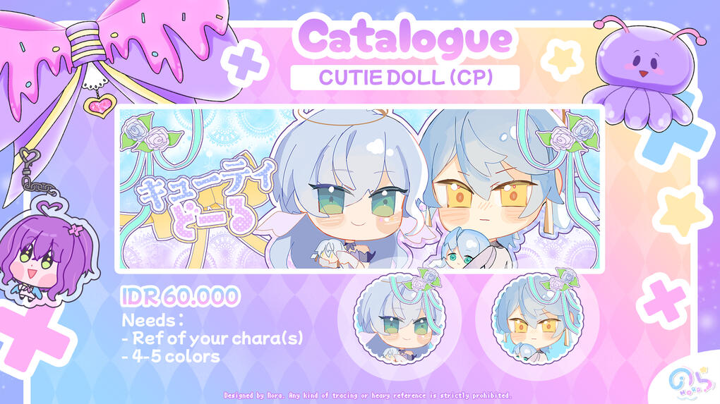 Semua desain yang ada di katalog akan diberi warna sesuai dengan foto yang diberikan. Kalau mau req warna, jangan lupa cantumin color palette di form :3 boleh berupa kode warna maupun foto6. REVISI