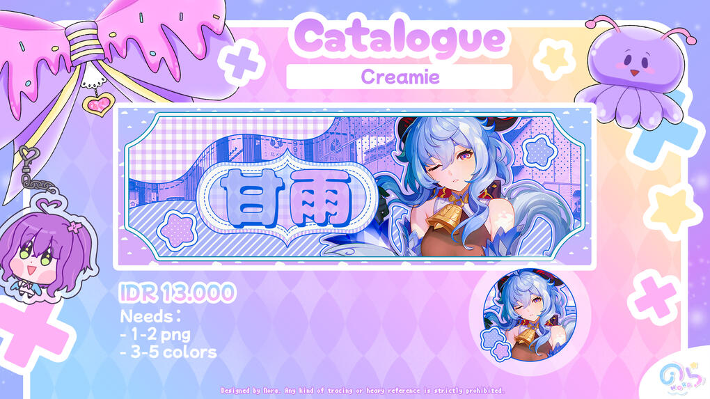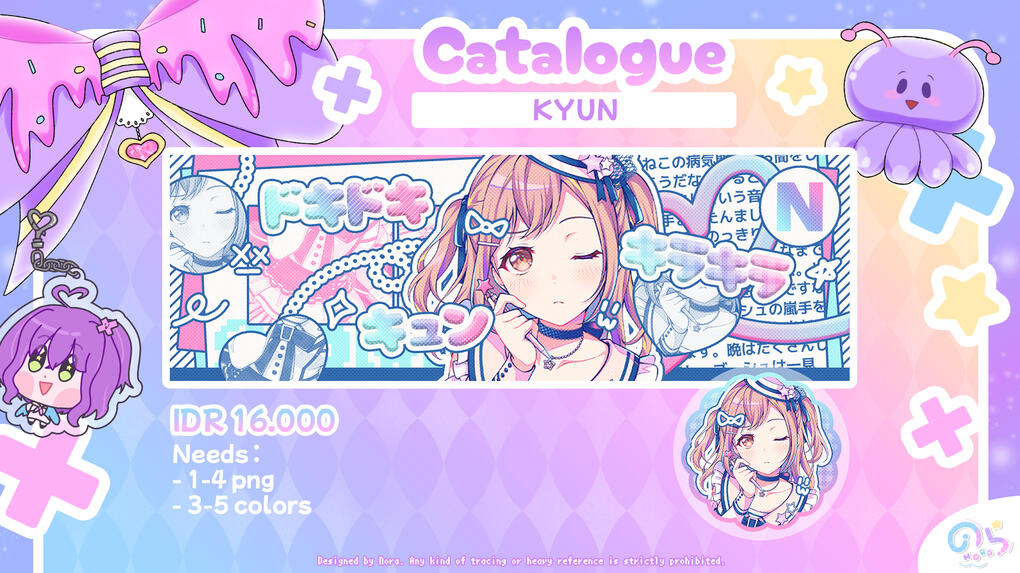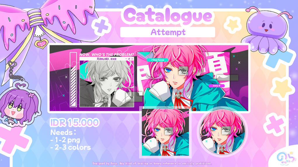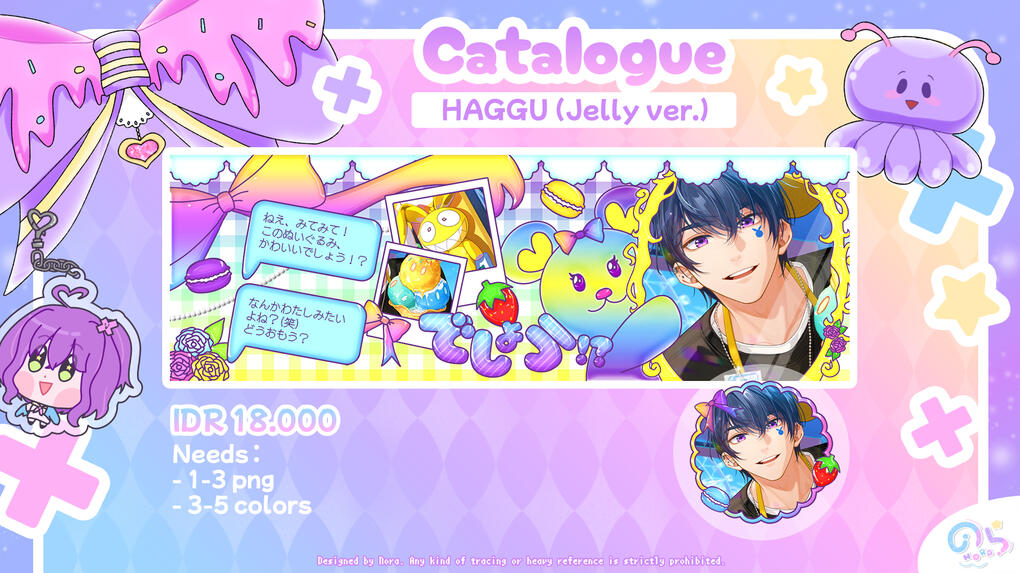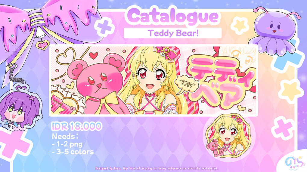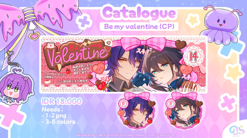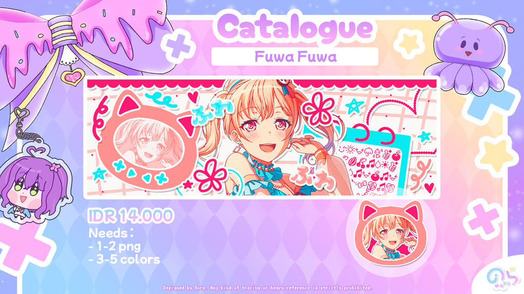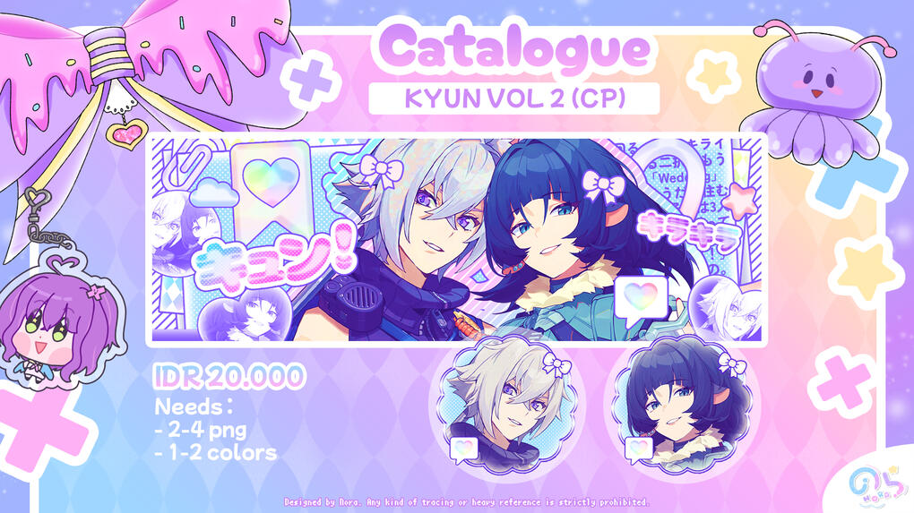 Semua desain yang ada di katalog akan diberi warna sesuai dengan foto yang diberikan. Kalau mau req warna, jangan lupa cantumin color palette di form :3 boleh berupa kode warna maupun foto6. REVISI